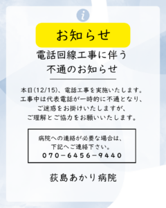 2025.12.15 電話回線工事に伴う不通のお知らせ 本日のみ(12/15)、電話工事を実施致します。 工事中は代表電話が一時的に不通となり、ご迷惑をお掛けいたしますが、 ご理解とご協力をお願いいたします。 尚、病院への連絡が必要な場合は、 お手数ですが下記へご連絡下さい。 070-6456-9440 医療法人社団美誠会 荻島あかり病院 事務長